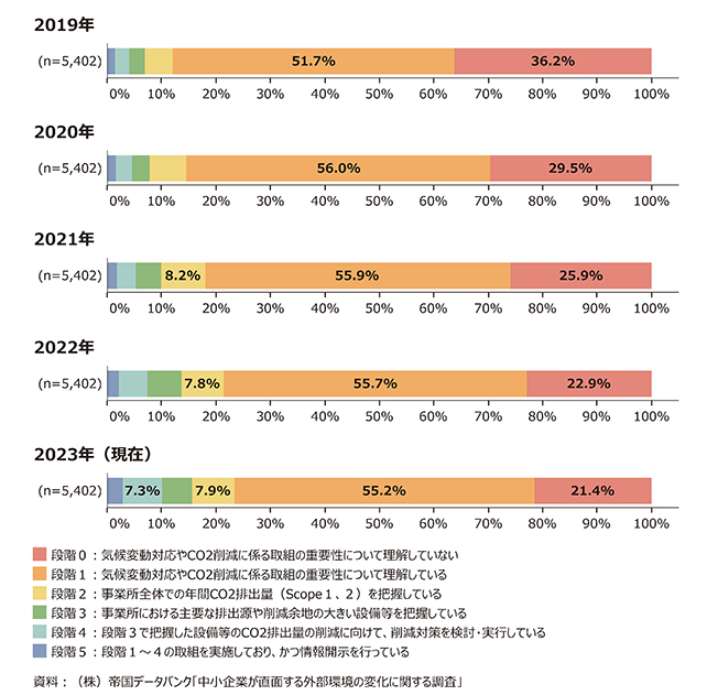 脱炭素化に取り組む企業は年々増加しています。中小企業庁が公表する「2024年版中小企業白書」からは、2019年から2023年までの5年間において、脱炭素化に取り組む企業の増加と取組状況の進展を見てとれます。